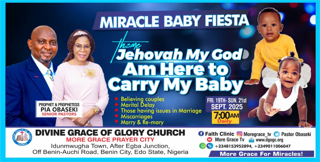 Benin City, Edo State, Nigeria – Divine Grace of Glory Church, also known as More Grace Prayer City, is delighted to announce the upcoming Miracle Baby Fiesta 2025, a three-day power-packed event themed “Jehovah My God, I Am Here to Carry My Baby.” The program will run from Friday 19th to Sunday 21st September 2025, starting at 7:00 AM daily at the church headquarters in Idunmwugha Town, after Egba Junction, Off Benin–Auchi Road, Benin City, Edo State, Nigeria.
