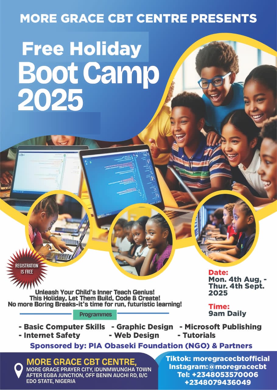 Benin City, Edo State, Nigeria – The PIA Obaseki Foundation (NGO) in partnership with More Grace CBT Centre is excited to announce the Free Holiday Boot Camp 2025, a one-month intensive and fun-filled program designed to unleash children’s inner tech genius.